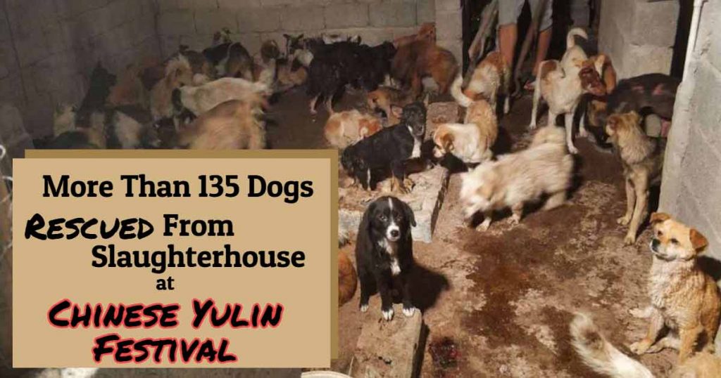 Recently, these Chinese activists arranged for the release of dogs from three different Yulin slaughterhouses. When infiltrating the facilities, they were shocked to come across blood-stained floors, dozens of emaciated and terrified dogs, and a man beating a dog on the head to its death. Luckily, the volunteers were able to rescue all of the 135 dogs they discovered and transport them to a temporary shelter, nursing and caring for their injuries. 3 of these dogs gave birth shortly after arriving at the shelter.